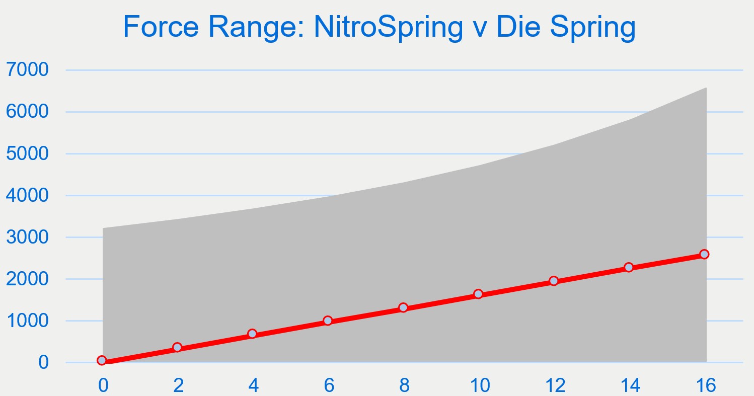NitroSprings can be used as a replacement or alternative spring type to die springs in most applications. The superior attributes of the NitroSpring offer engineers and designers significant benefits during application design involving spring force.