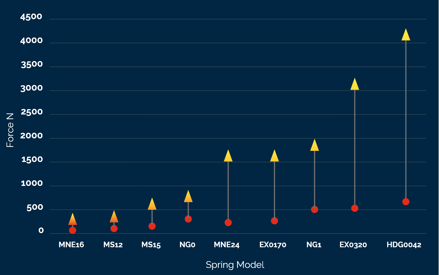 Force Range – In variable NitroSprings, you can adjust the pressure to your desired force. Therefore, if you ordered a spring with a force range of 300N – 5000N, it would arrive charged to 5000N and you could reduce it anywhere down to 300N.